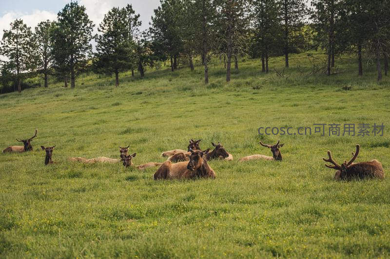 一群麋鹿安静地卧在翠绿的山坡草地上,背景是茂密的松树林,阳光洒落,营造出宁静祥和的自然生态景象。