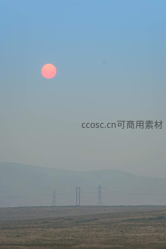 一轮粉红色的太阳缓缓沉入远方的山峦,薄雾弥漫,几座电力塔静静伫立,勾勒出一幅梦幻而宁静的黄昏图景。