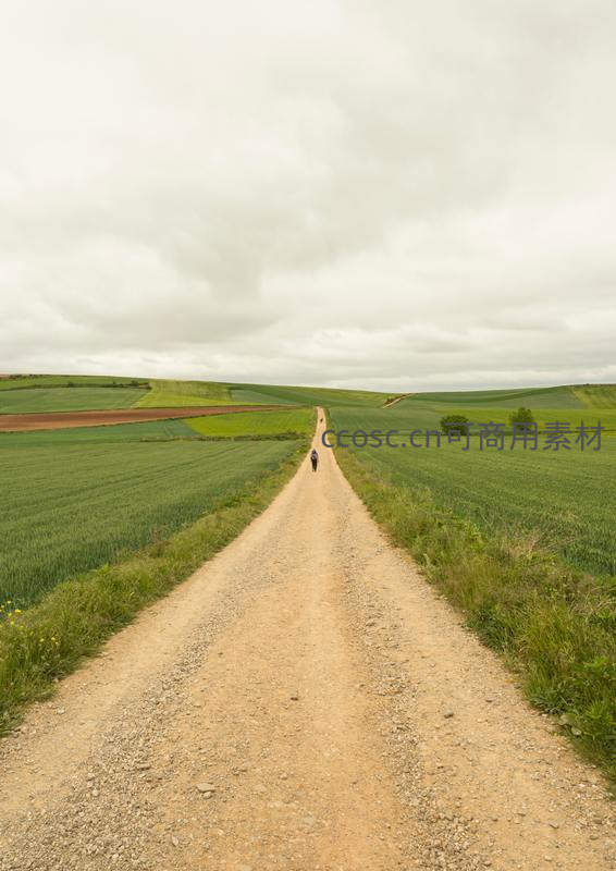 一条笔直的乡间土路延伸至天际,两旁是广袤的绿色农田,远方一个孤独的身影正沿着小路前行,天空云层厚重。