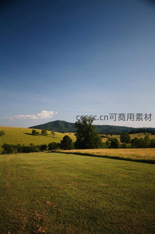 一片无垠的绿色草原延伸至远方,背景是深邃的蓝色天空和轮廓分明的山丘,几棵孤树点缀其间,尽显大自然的辽阔与纯净。
