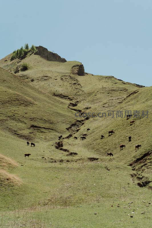 在起伏的绿色山坡上,一群牛分散在各处悠闲地吃草,山顶点缀着几棵松树,晴朗的天空下呈现出一派生机勃勃的牧场景象。