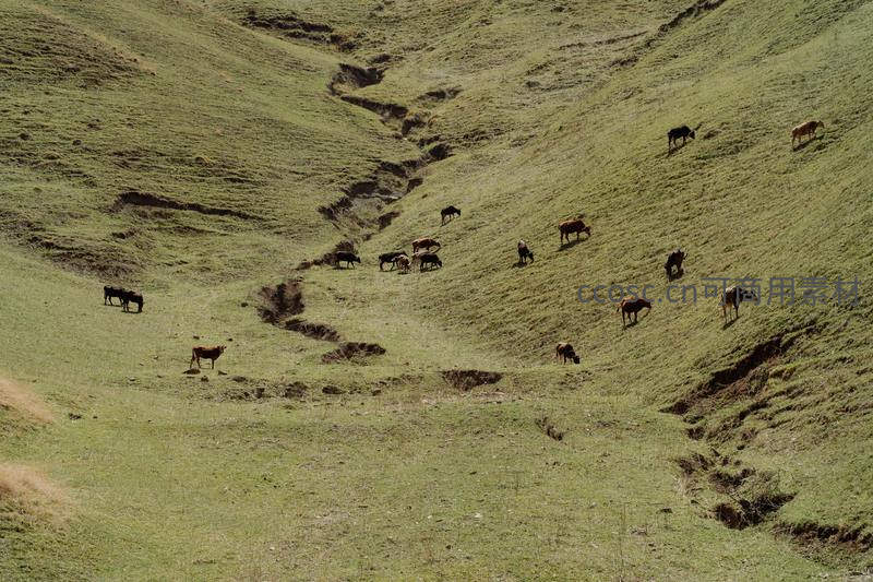 一群牛在起伏的绿色山坡上悠闲吃草,阳光洒落,构成一幅宁静祥和的田园牧歌图景。