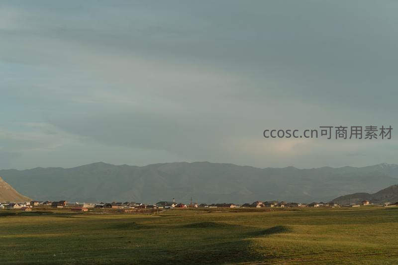 广袤草原延伸至远方,山峦叠嶂,山脚下的小村庄在柔和光线下显得格外宁静安详。