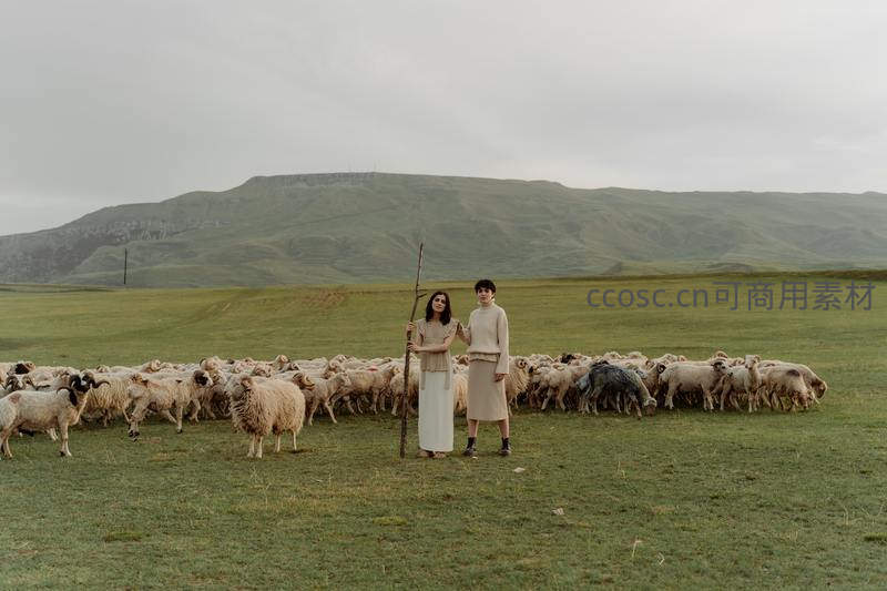 两位身着素衣的牧羊人手持长杖,伫立在羊群中央,背景是连绵青山,展现人与自然的和谐共生。