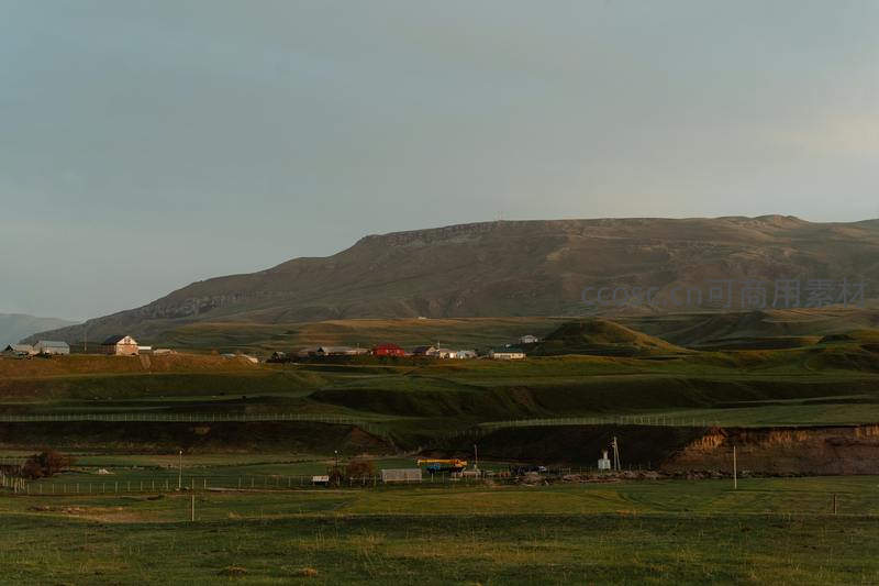 起伏的绿色山谷中散落着几座农舍,背景是雄伟的平顶山脉,夕阳余晖洒在大地,营造出一种远离尘嚣的宁静与辽阔感。