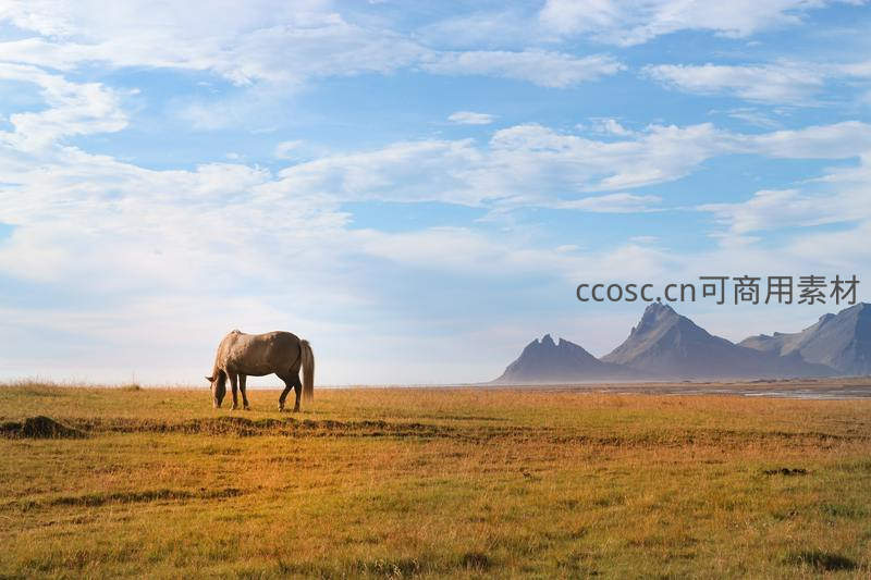 一匹棕色骏马在金黄草地上低头觅食,身后是壮丽的锯齿状山脉和广阔无垠的蓝天白云,画面充满自由与宁静的诗意。