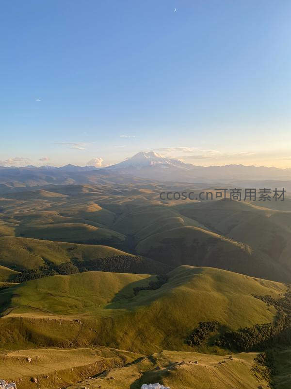 从高空俯瞰,雪山巍峨耸立于远方,脚下是无垠的绿色草原,阳光洒落,光影交错,构成一幅宁静而壮丽的自然画卷。
