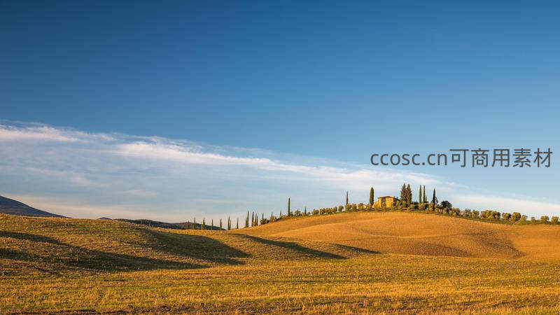 意大利托斯卡纳标志性的金色起伏丘陵,在晴朗蓝天的映衬下,点缀着农舍与高耸柏树,充满诗意的田园风光。