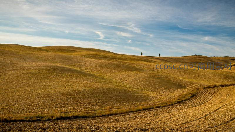 金黄色的麦田如波浪般起伏,柔和的阳光洒在田垄上,远处天际线清晰,展现秋日田野的丰饶与宁静之美。