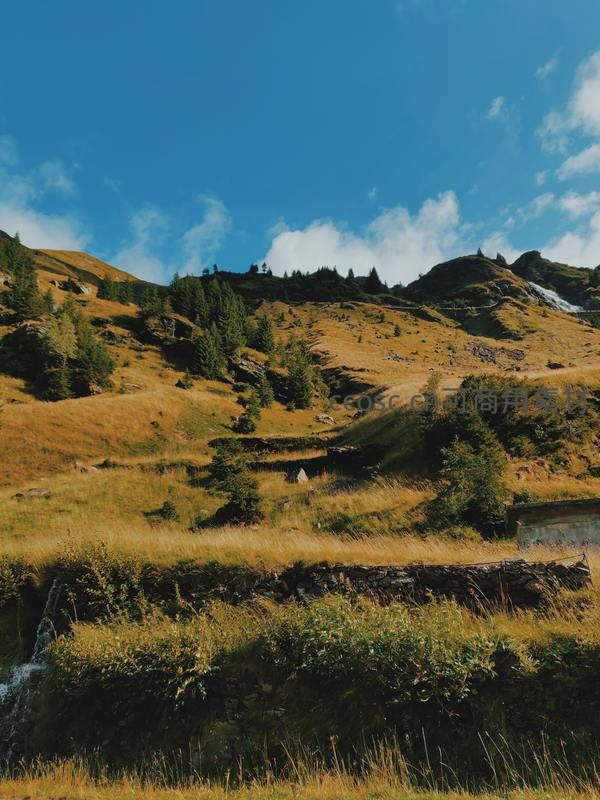 金黄草坡与翠绿松林交织,清澈溪水沿石墙流淌,远山在晴空下层次分明,宁静而壮美。