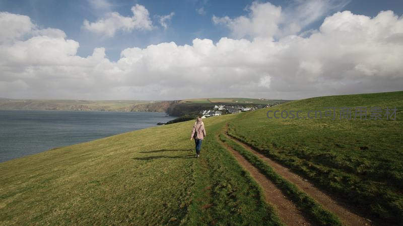一位行人沿着临海的绿色斜坡小径前行,远方是蔚蓝大海与白色村落,天空云卷云舒,意境悠远。