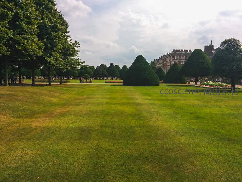 广阔的皇家园林中,修剪整齐的草坪与锥形绿树相映成趣,远处宏伟古堡在蓝天白云下更显庄严典雅。
