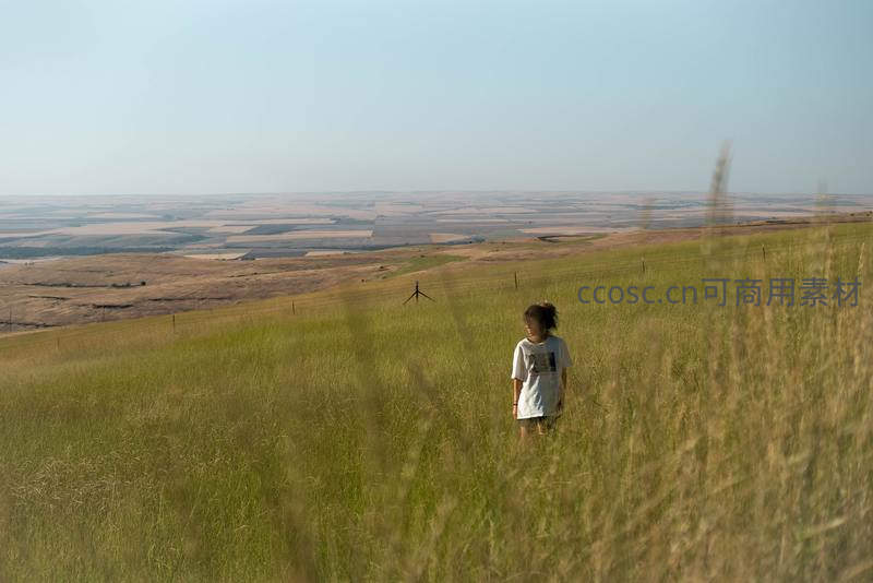 孩童漫步金色草坡,远眺大地如画