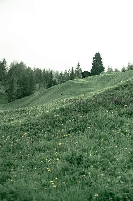 连绵起伏的绿色草坡上,几座小木屋静静伫立在松林边缘,远方山影朦胧,充满田园诗意。