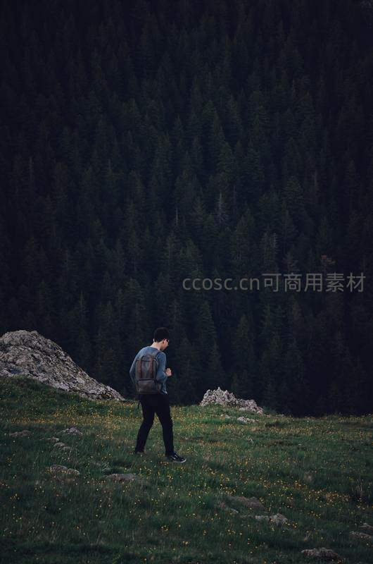 一名背着登山包的旅者正沿着开满野花的草坡前行,身后是连绵无际、深邃幽暗的针叶林,充满探索与自由的气息。