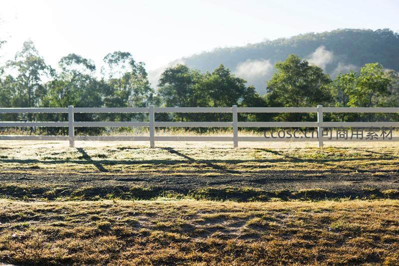 晨光洒落白色围栏牧场草地薄雾弥漫