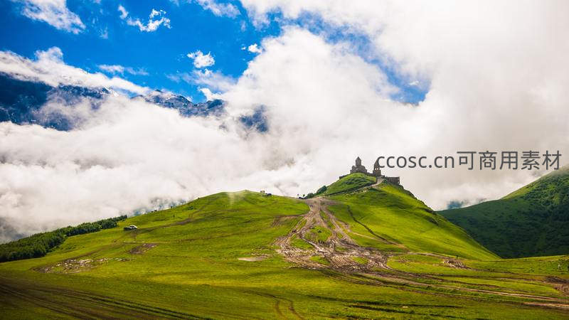 山顶古堡隐现于云海之上的翠绿山丘