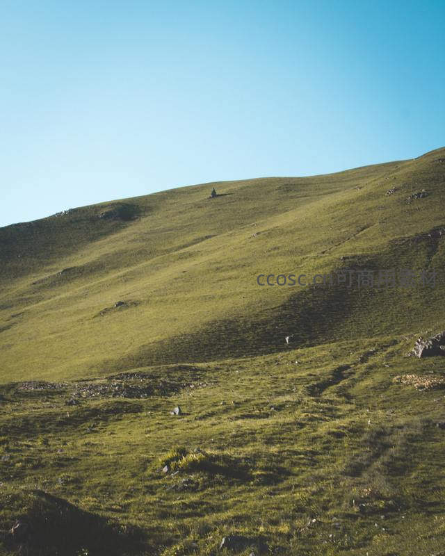 一片广阔的绿色山坡沐浴在明媚阳光下,天空湛蓝无云,草地上散落着几块岩石,显得格外宁静与开阔。
