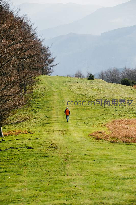 一位穿橙色外套的人沿着绿草如茵的小径走向远方,两侧是光秃的树木和朦胧的山脉,画面充满探索与宁静之感。