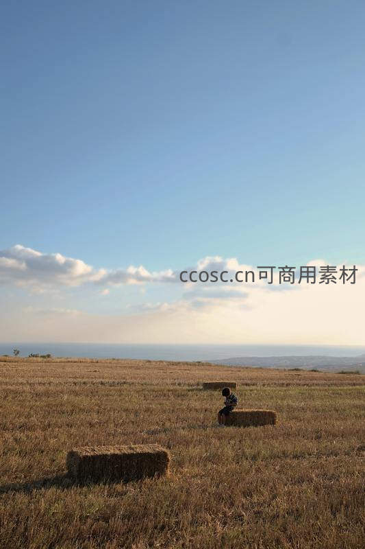 在广袤的金色麦田中,一个孩子独自坐在干草捆上,远眺着地平线上的蔚蓝大海,天空澄澈,云卷云舒。