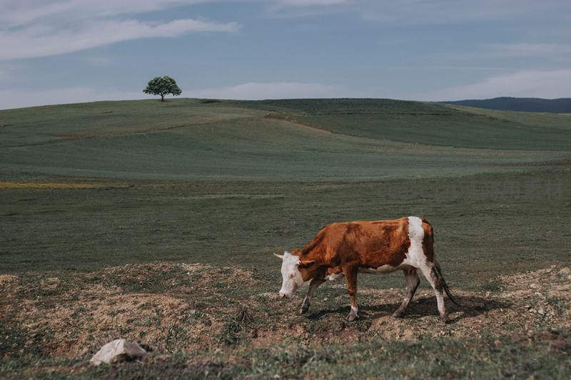一头棕白相间的牛在起伏的绿色草原上悠闲漫步,远处的山丘顶上孤零零地伫立着一棵大树,构成一幅宁静的田园画卷。