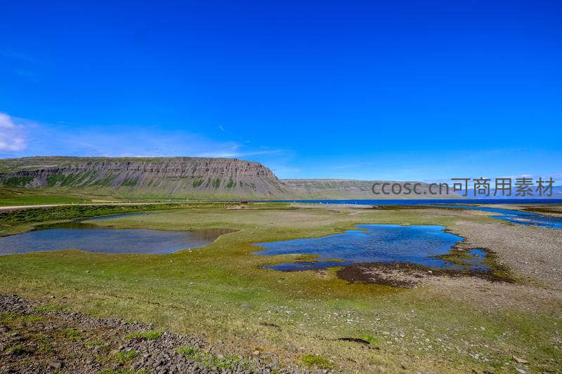 一片开阔的高原湿地上散布着大小不一的水洼,远处是陡峭层叠的巨型山崖,在晴朗的蓝天下展现出原始而壮丽的自然地貌。