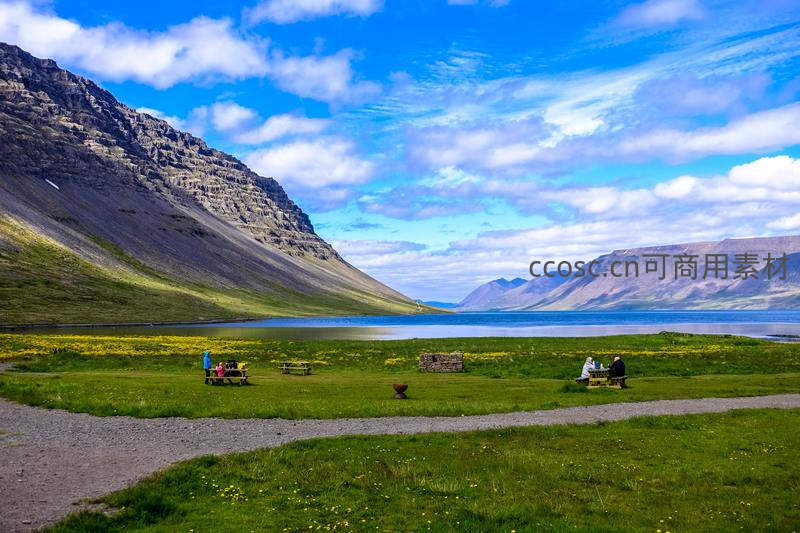 碧蓝天空下,雄伟山脉环抱平静湖泊,绿茵草地上游客悠然野餐,尽享大自然的宁静与壮美。