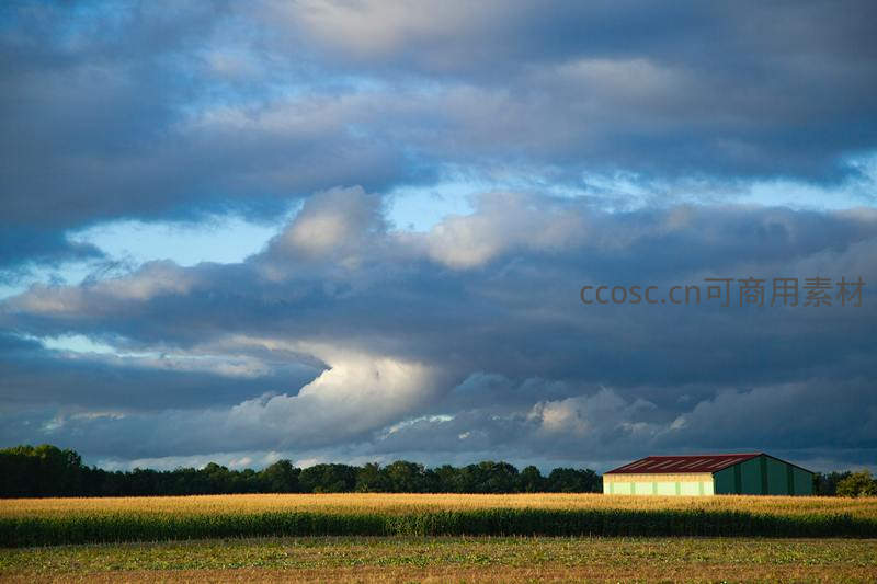 暮色云层下的农舍与金色麦田