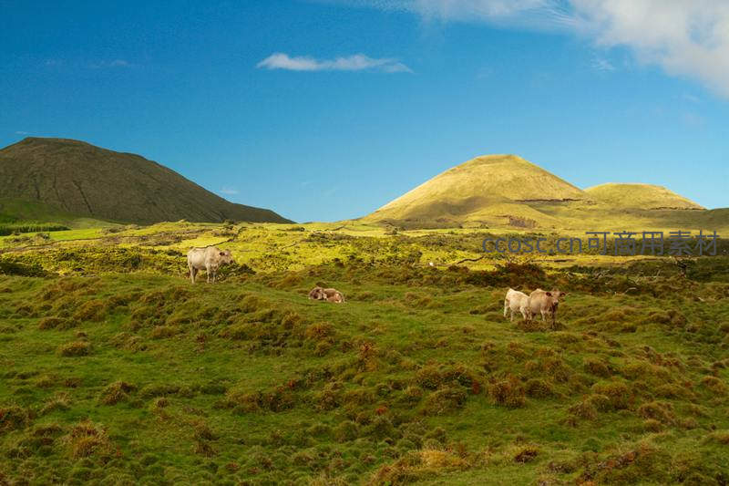 温暖的阳光洒在起伏的火山锥形山坡上,几头牛儿在翠绿的草地上悠闲吃草,构成一幅田园牧歌图。