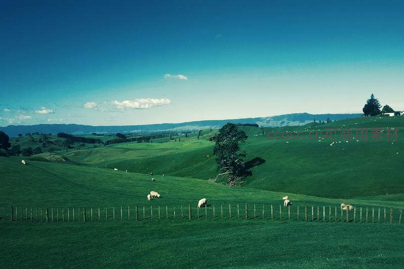 碧绿牧场上的悠闲羊群与蓝天