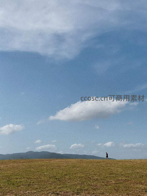 一人独行于无垠的草原之上,头顶是湛蓝天空与朵朵白云,画面传递出自由、孤独与心灵放空的意境。