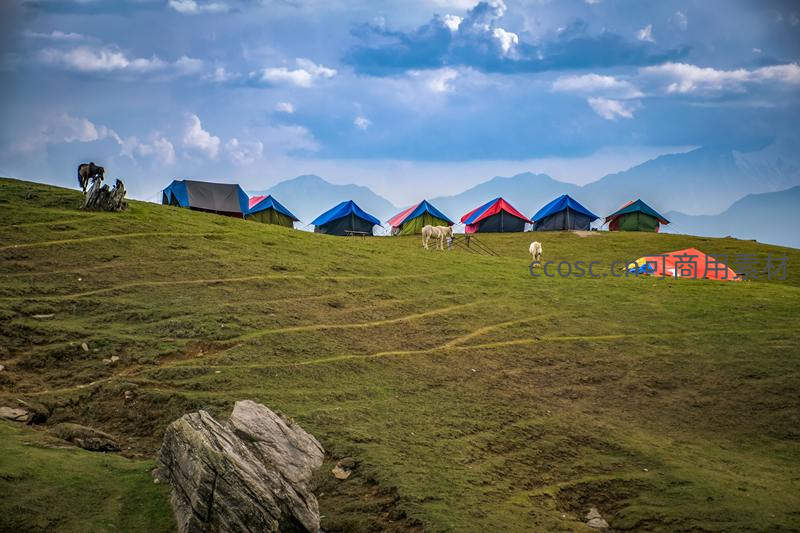 高山营地:彩色帐篷与马儿相伴
