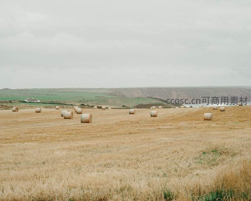 收割后的金色麦田上散落着整齐的圆形草垛,远处是连绵的绿色丘陵和海岸线,展现出一派宁静而丰饶的乡村景象。