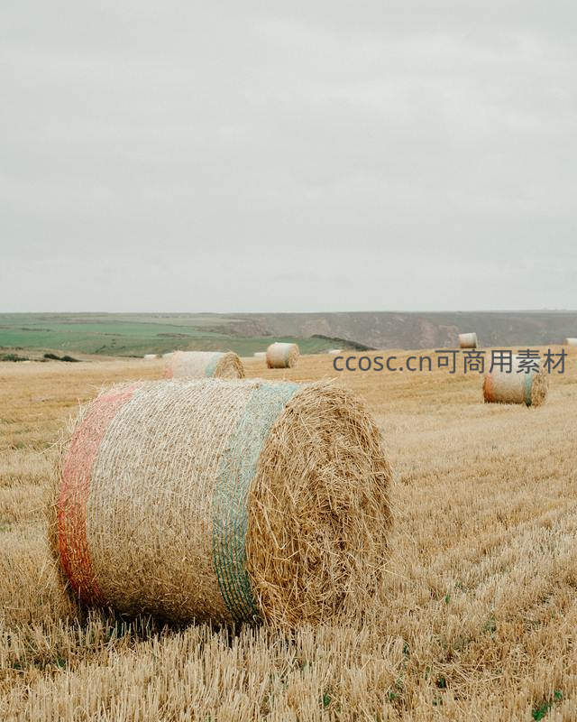 一个巨大的圆形草垛占据了画面前景,其精细的秸秆纹理和彩色捆扎带清晰可见,背景是辽阔的收割后田野和远处山峦。