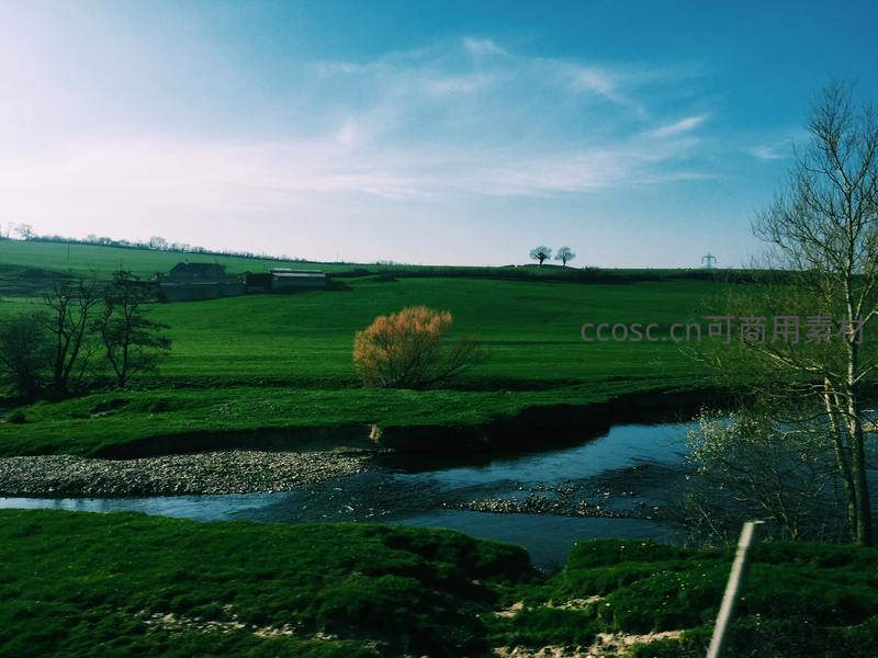 清澈的小溪蜿蜒流过广袤的绿色田野,两岸树木点缀其间,蓝天白云映衬下,构成一幅宁静祥和的田园画卷。