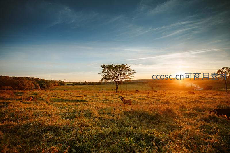 夕阳西下,金色光辉铺满辽阔草原,一棵孤树与几头牛的剪影勾勒出宁静而壮美的画面,天空云彩绚烂如画。