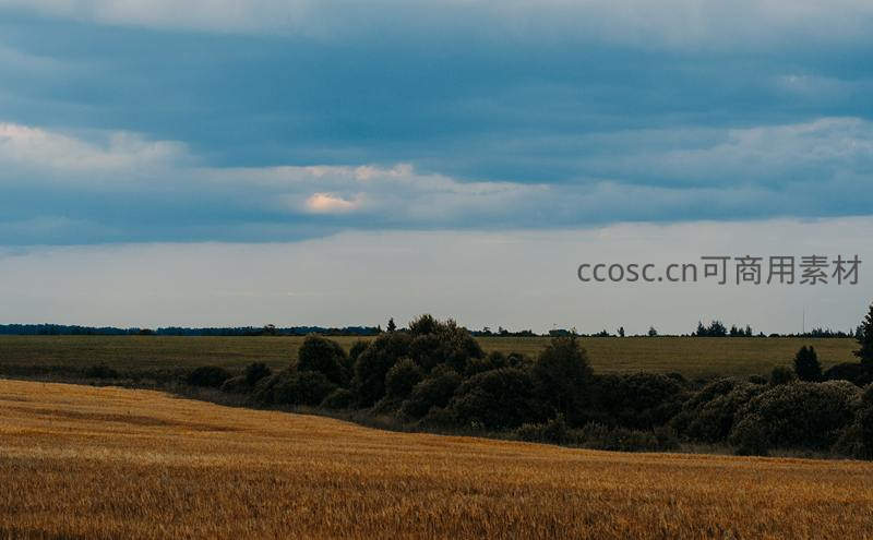 成熟的金色麦浪在厚重云层下铺展,远处树丛勾勒地平线,呈现一种沉静而丰饶的乡村农业景象。