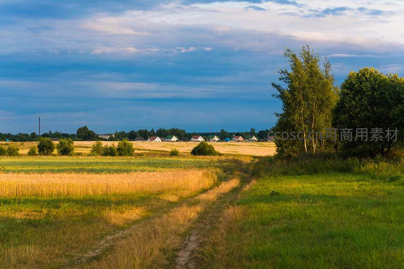 一条蜿蜒土路穿过绿野与麦田,引向远处炊烟袅袅的村庄,两旁绿树成荫,尽显安逸的乡村生活气息。
