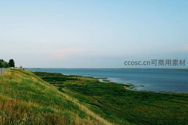 缓坡草地延伸至平静湖面,水天相接处泛着柔和光晕,展现湖滨湿地的开阔与宁静,令人心旷神怡。