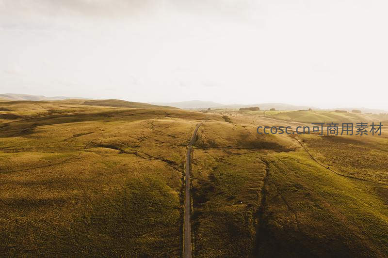 夕阳余晖染黄连绵起伏的丘陵,一条笔直小路贯穿其中,仿佛通向远方未知的宁静村落,意境悠远开阔。