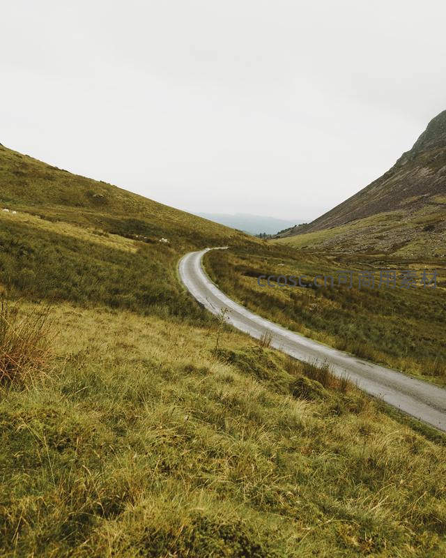 一条湿漉漉的柏油路在广袤无垠的草坡间曲折延伸,两侧是起伏的山峦,远方云雾弥漫,营造出静谧而辽阔的意境。