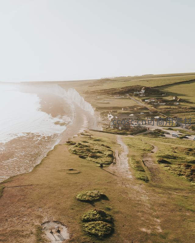 从空中俯瞰,白色峭壁与碧绿草原交相辉映,下方散落着几座小屋,构成一幅宁静祥和的海边田园画卷。