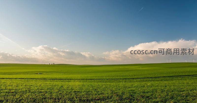 一片无边无际的翠绿田野在蔚蓝天空下铺展,远处点缀着几座风车,云朵悠然飘浮,展现大自然的恢弘与纯净。