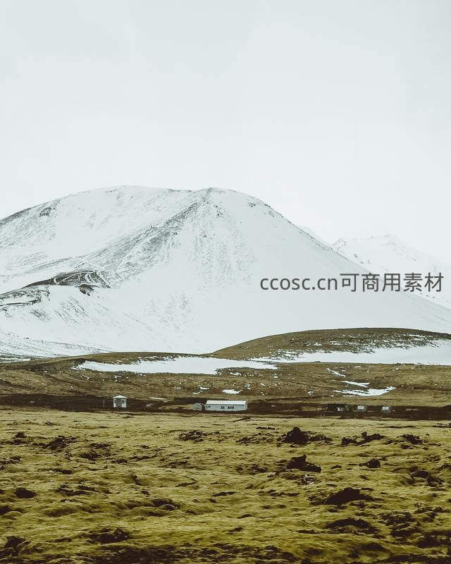 白雪覆盖的巍峨山峰下,几座白色小屋静卧于广袤的苔原之上,天地苍茫,尽显自然的壮阔与宁静。