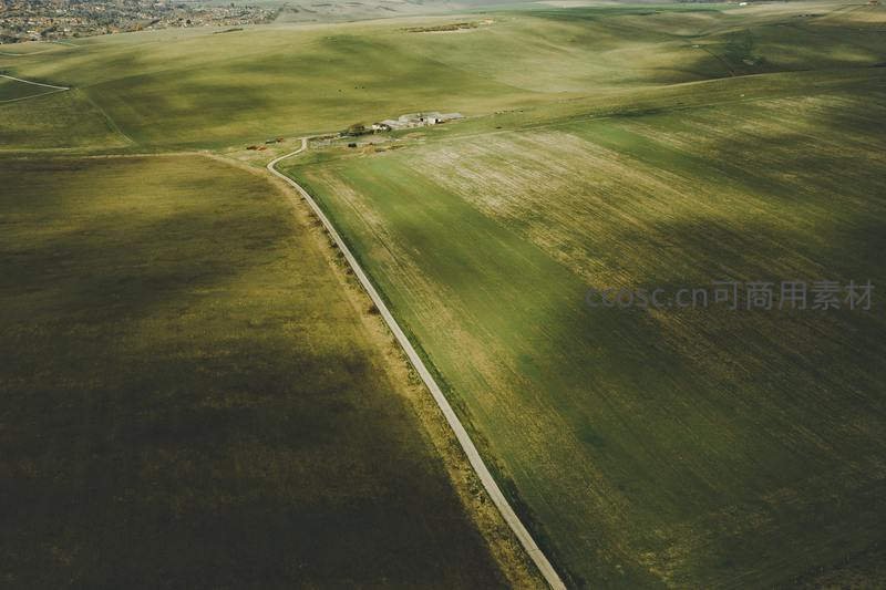 温暖的阳光斜照在连绵起伏的绿色田野上,一条笔直的道路如丝带般延伸,勾勒出大地的纹理与生命的律动。