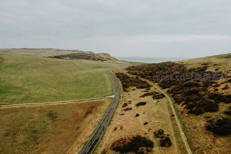 一条公路从内陆的绿色山丘蜿蜒而出,穿越干燥的灌木丛,最终通向远方平静的海洋,展现地理的壮美过渡。