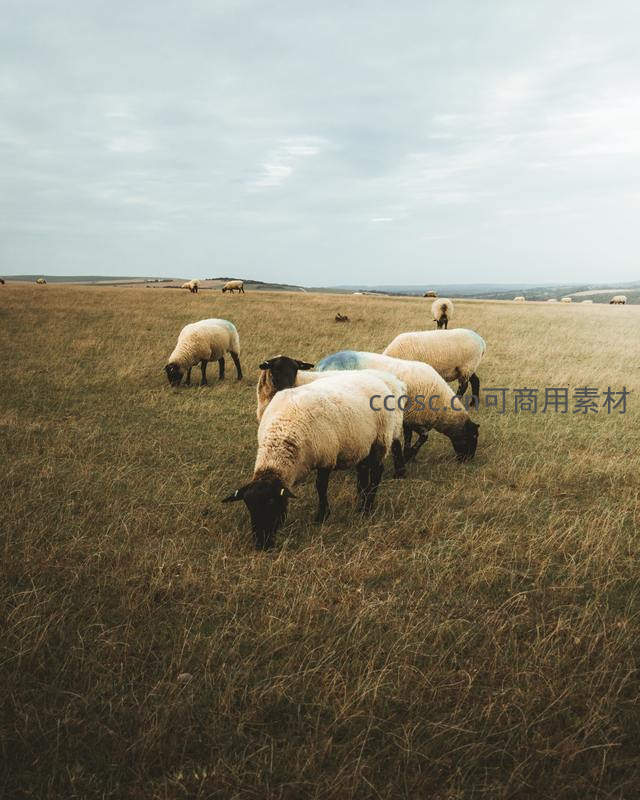 在辽阔的金色草原上,一群绵羊低头专注地啃食着青草,远处是连绵的丘陵和淡蓝色天空,营造出宁静祥和的田园景象。
