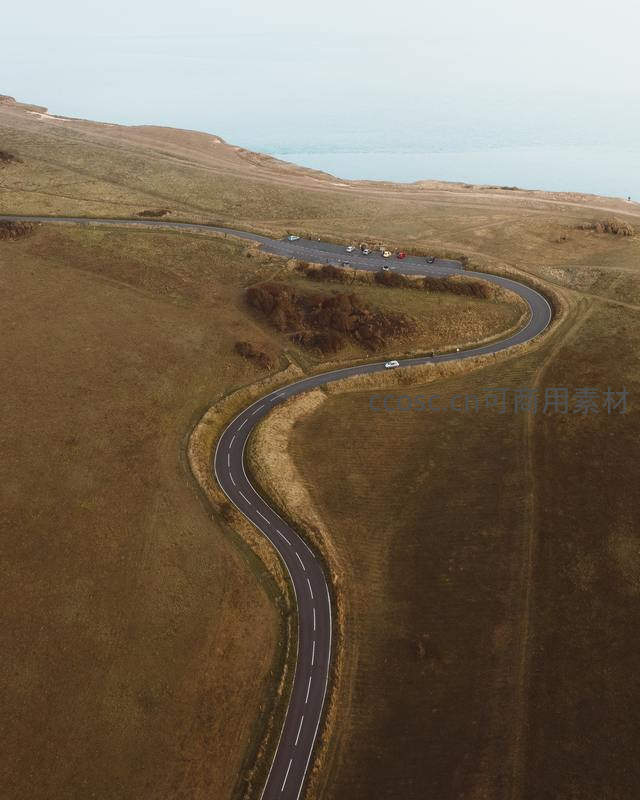 一条S形公路沿着起伏的棕色山丘蜿蜒而下,直通远方的海岸线,几辆汽车点缀其间,构成一幅壮丽的沿海自驾风景画。