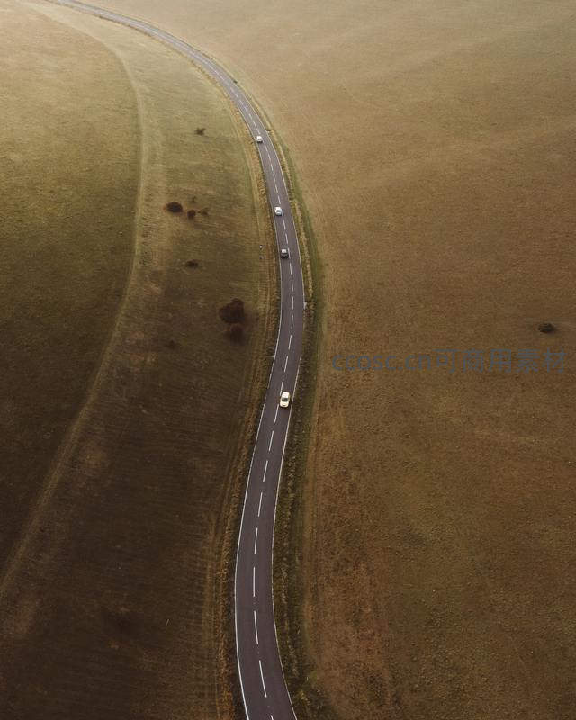 从高空垂直视角看去,一条笔直的公路划开广阔的黄绿色田野,几辆汽车在公路上行驶,形成简洁而富有几何美感的画面。