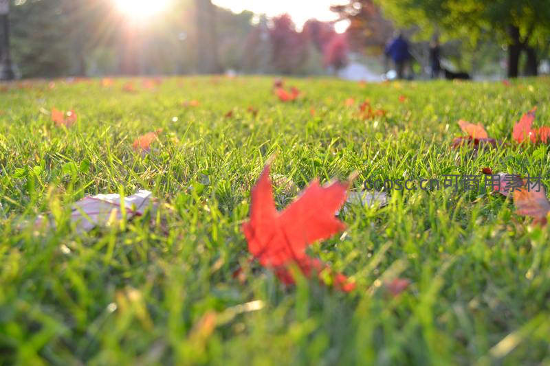 一片鲜红的枫叶静静躺在翠绿草地上,背景是朦胧的行人和耀眼的夕阳光芒,微距视角捕捉了秋日午后最温柔的瞬间。